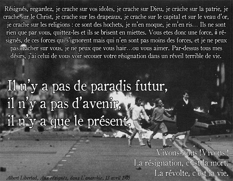Faire ressortir de ce texte de 1905, sur cette image d’aujourd’hui, « Il n’y a pas de paradis futur / Il n’y a pas d’avenir / Il n’y a que le présent » et le coller sur les murs, je trouve ça très actuel, et plutôt de bon augure. Le texte, vitaliste plus que « moraliste », vaut pour moi mieux que toutes versions de « la communisation ou la mort ».
