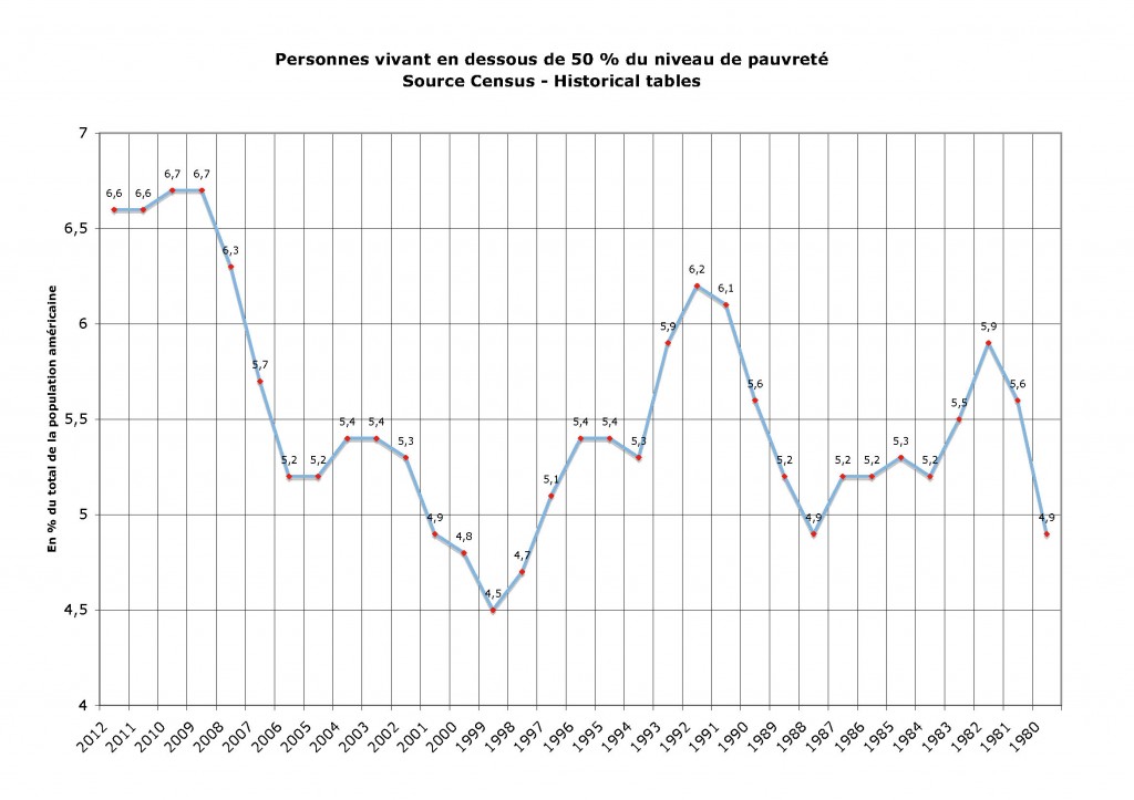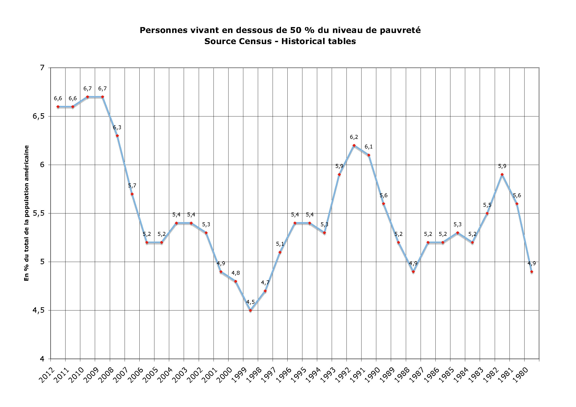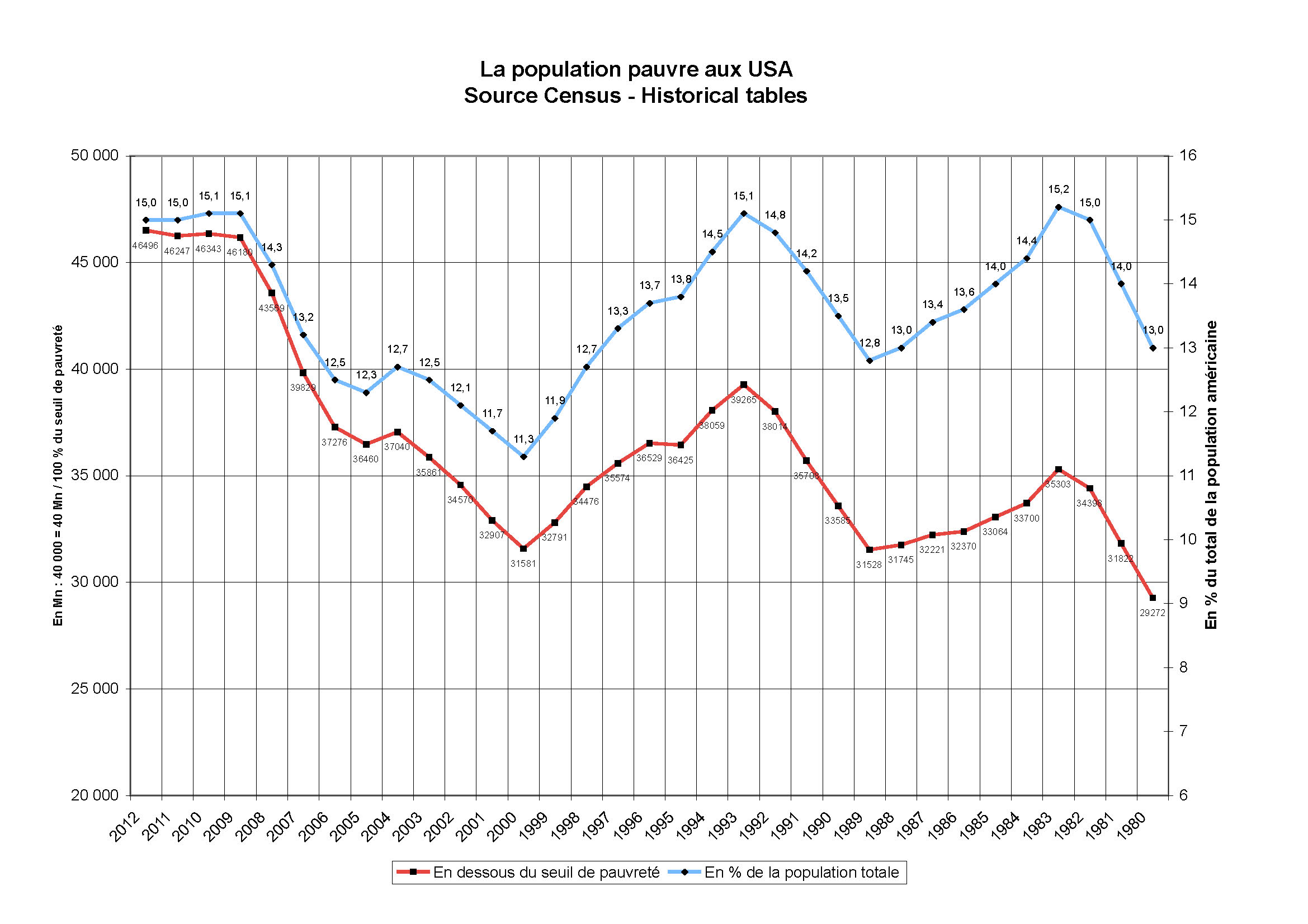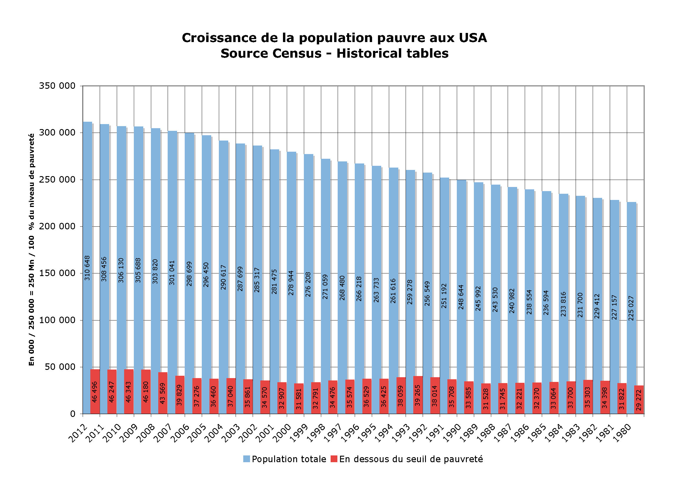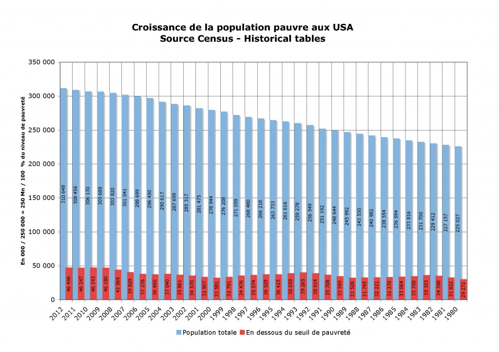 Chaque année, les USA ont compté en moyenne 1,3 million de pauvres supplémentaire. Dans les faits , l’explosion de la pauvreté se limite aux années 2007-2008, le nombre de pauvres est stabilisé aux alentours de 46,3 Mn dès 2009.