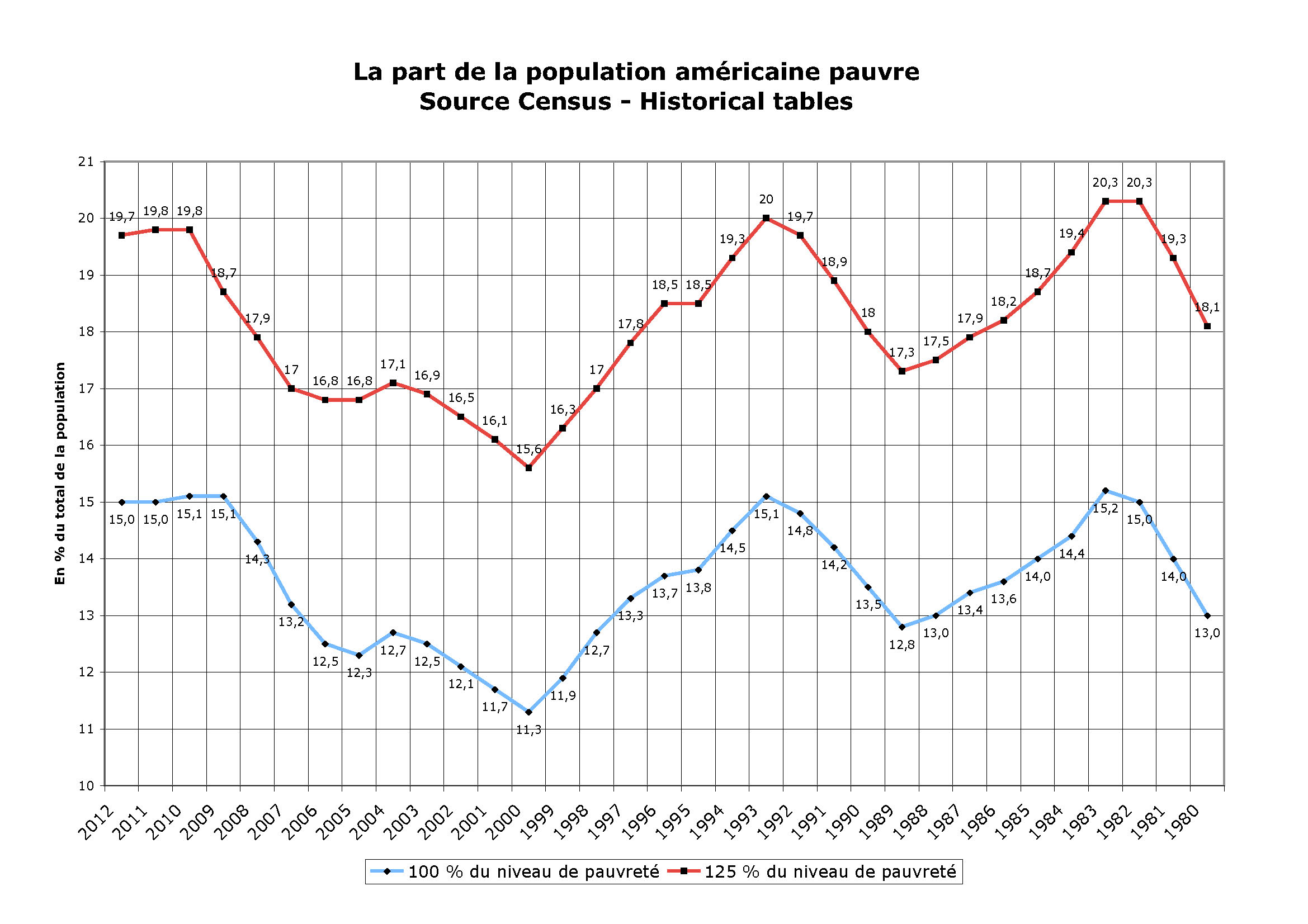 Le seuil de pauvreté retenue est le seuil de 100 % du niveau de pauvreté. Il est dommage que le seuil de 125 % n’ait pas été retenu par le Census pour ces Historical Tables, ce seuil est beaucoup plus proche des mesures de la pauvreté utilisées en Europe.