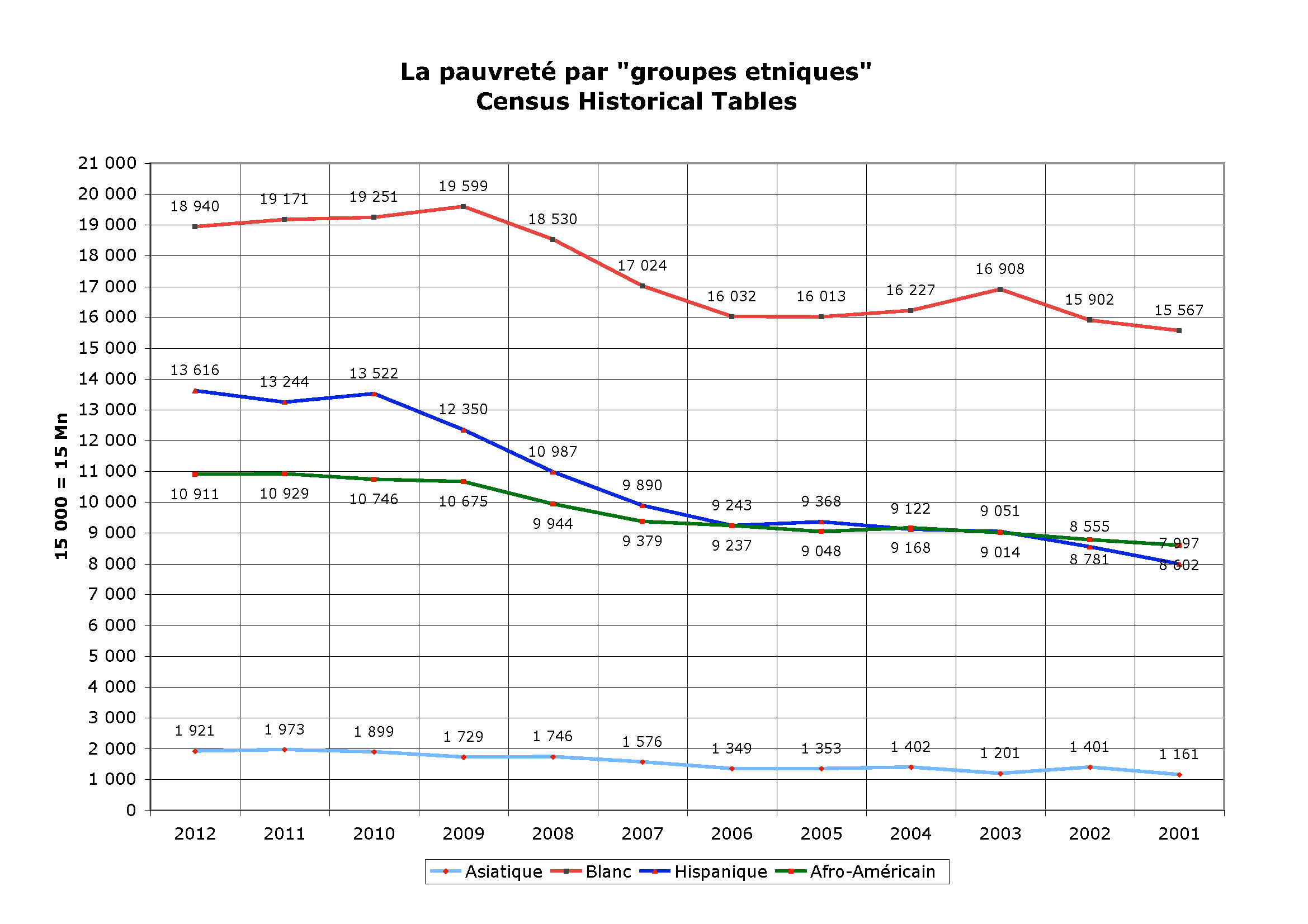 Il faut noter que les blancs, affectés fortement en 2007-2009 par la pauvreté, ont pu ensuite inverser la tendance, le nombre de pauvres blancs a reflué dès 2010 alors que ce nombre stagnait pour les Asiatiques et les Afro-Américains dès 2011 sous l’action des aides sociales.