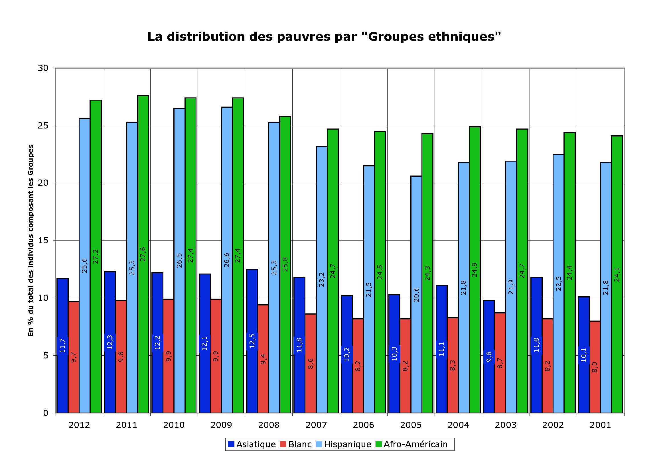 À ce titre, les groupes asiatiques et blancs paraissent peu affectés par les ravages de la pauvreté. Le pourcentage des blancs pauvres ou des Asiatiques pauvres n’a pas connu une forte augmentation. Ce sont les Afro-Américains et les Hispaniques qui ont subi le plus rudement l’augmentation de la pauvreté.