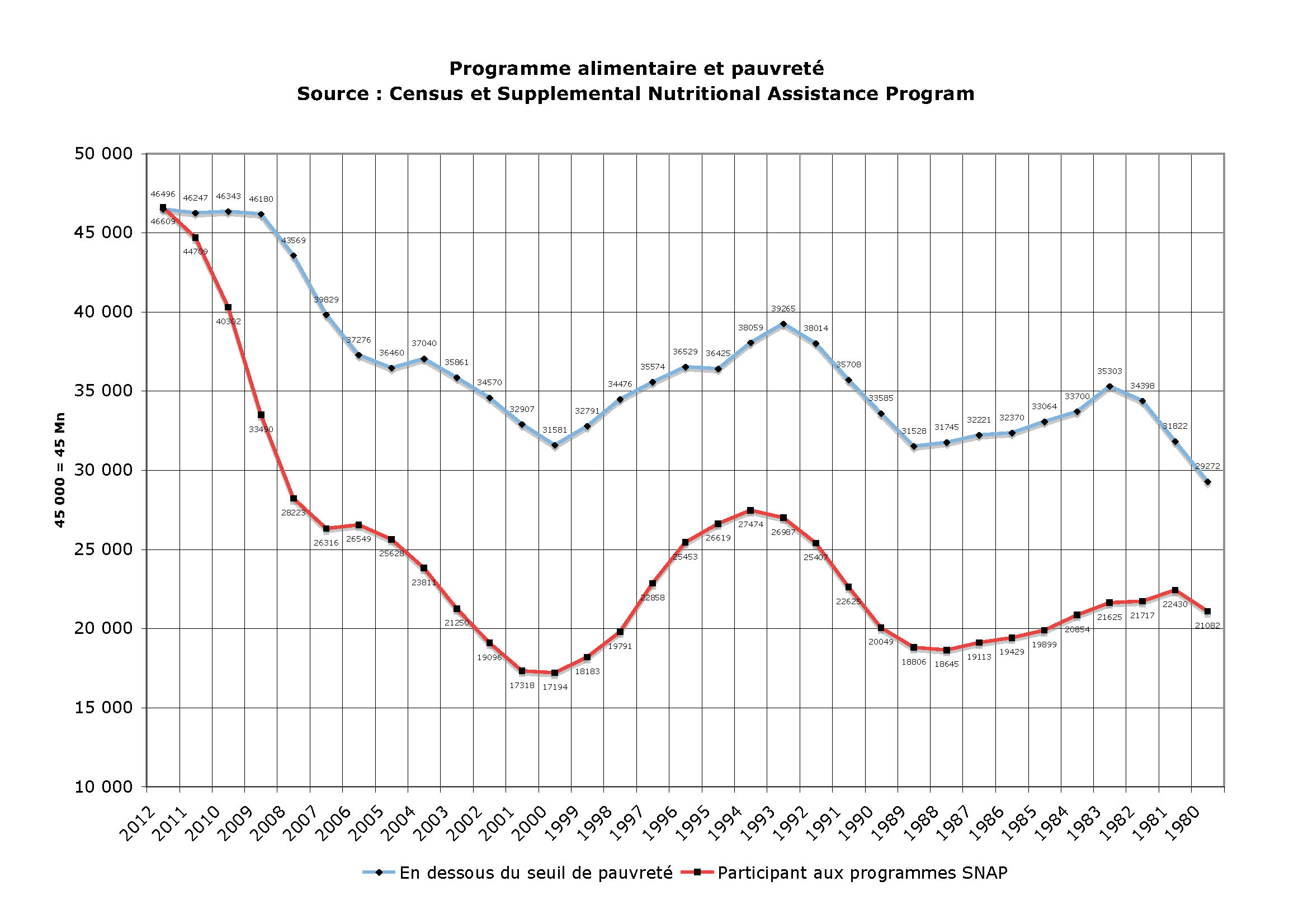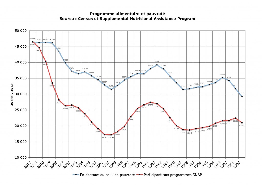 Il ne faut pas confondre les aides alimentaires avec le programme des Food Stamps qui n’existent plus depuis longtemps. Le programme alimentaire peut aider les élèves des cantines scolaires, des personnes âgées, des familles monoparentales, des personnes seules : ce n’est plus la soupe populaire !!! C’est une très bonne mesure des difficultés rencontrées par des millions d’Américains pauvres ou économiquement fragiles. Mais on ne saurait tenir pour strictement équivalent le nombre d’allocataires des programmes alimentaires du SNAP et le nombre de pauvres.